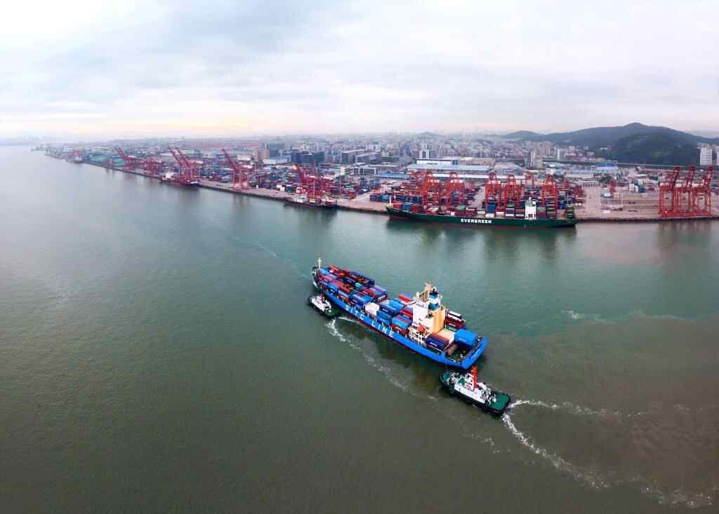 在福建自贸区厦门片区东渡港区,一艘货轮向码头靠拢(2017年8月26日无人机照片)。(新华社记者姜克红摄)