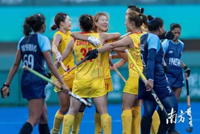 10月6日,曲棍球运动员梁美玉进球后与队友庆祝。中国队击败印度队进入决赛。