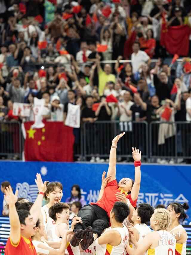10月5日晚,在杭州亚运会女篮决赛中,中国队74比72击败日本队, 赛后女篮姑娘们举起主教练郑薇庆祝比赛胜利。