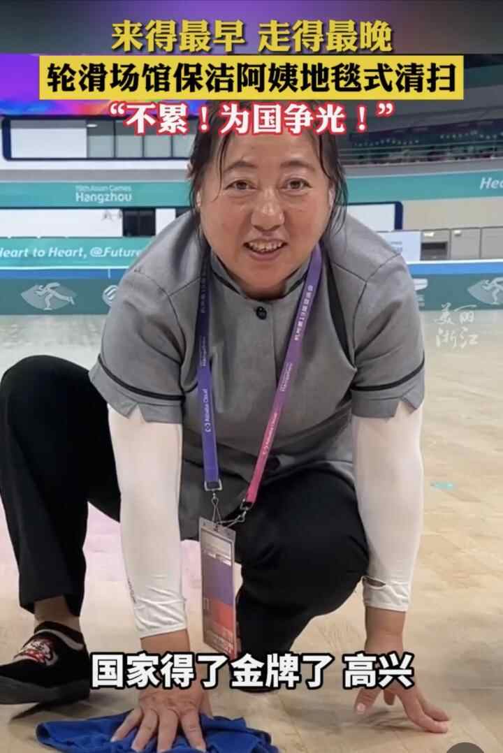 10月6日,潮新闻记者联系到轮滑场馆保洁工作人员蒋晓梅。“我在保洁群里看到了视频,能得到大家一致好评,心里还是非常激动。”