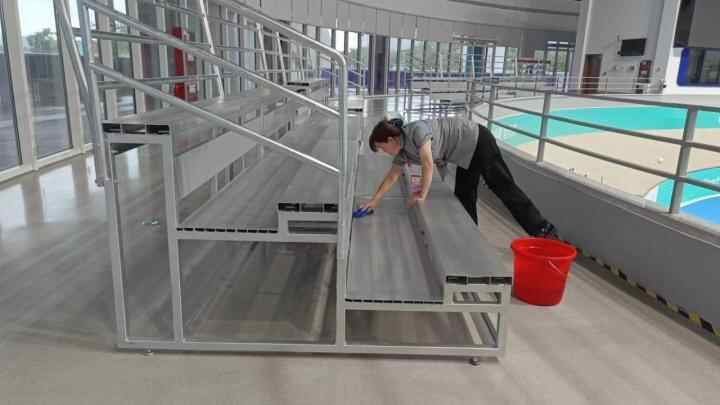 “场馆6点开门,我们差不多5点半左右就到了。下班时间则根据当天比赛情况而定。”场馆的清洁工作,可不像日常扫地、拖地,需要一群人先用大拖把拖个几遍,再用抹布一遍遍擦灰尘。有污渍的地方,还得反复用毛巾使劲擦除。