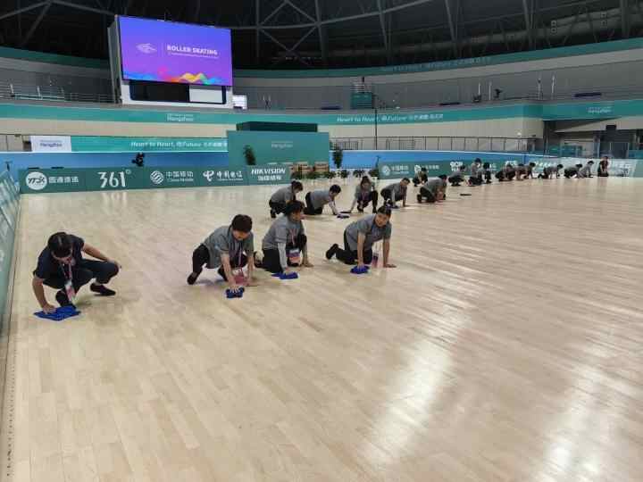 区域面积大,清洁并非易事。场地必须达到竞赛标准,同时还得有应对突发情况的能力。这群清洁阿姨们可是付出了不少心力。