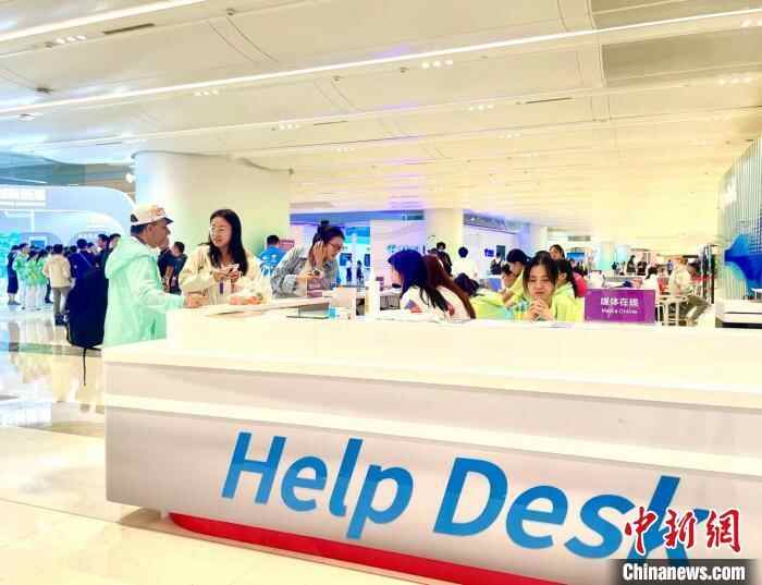 杭州亚运会主媒体中心内的总服务台前,工作人员服务中外媒体。张煜欢 摄