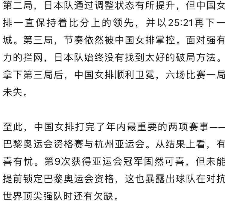 在7日晚进行的杭州亚运会女排项目决赛中,中国女排3:0战胜日本队,以六战全胜且一局未失的战绩成功卫冕。这是中国女排第9次获得亚运会冠军。