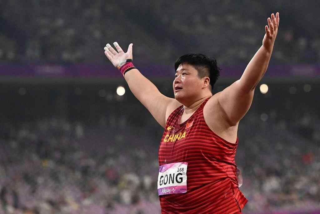 田径女子铅球决赛,巩立姣夺得冠军,实现亚运会上的三连冠。当她完成最后一投,现场响起了她曾经唱给自己的《勇气》。
