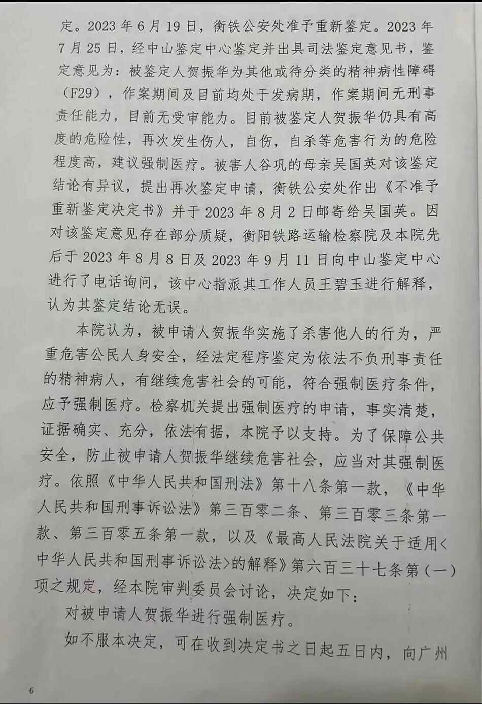 2023年9月20日,经审判委员会讨论,衡阳铁路运输法院作出决定:对被申请人贺振华进行强制医疗。
