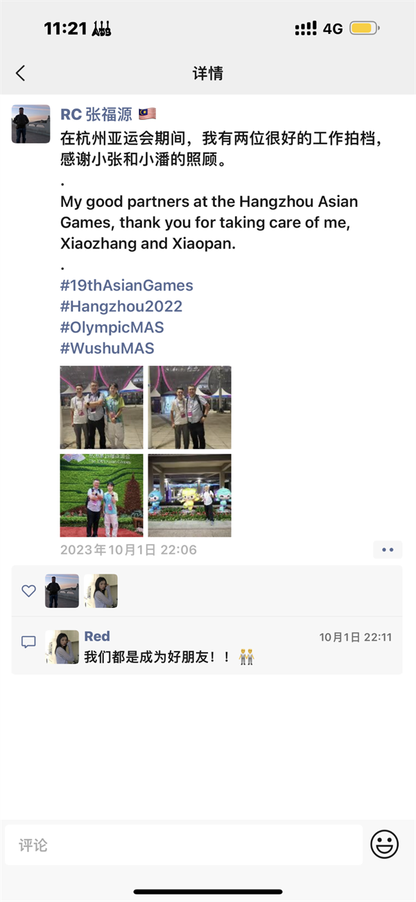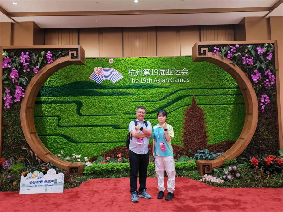 “这位国际友人负责武术比赛相关业务,我与他只能在武术场馆碰面。虽然不是直接服务对象,但每一次我与代表团一起前往武术场馆,看到对方,我们都会调侃道‘回家了’。”潘宇新说,“我们的服务模式更像是朋友——互相问好、畅谈美食、对这次亚运会感想等等。他回国的前一天,我和代表团正在观看田径比赛,他是特地打车到场馆,只是为了道句离别与感谢。这一份唯一的合照成为我们的离别礼物。” 潘宇新说道。