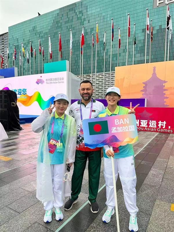 浙外NOC服务团队南亚大区志愿者靳奕佳笑着说,她也遇到了一件有趣的事情。“在协助孟加拉国代表团参加欢迎仪式时,一位孟加拉国射击队领队主动询问我们工作是否辛苦,并对我们在雨天还在坚守岗位工作表示感谢。随后,他开心地邀请我们一起合照,他说我们的热情服务为他的亚运之旅增添了温暖。”令靳奕佳感动的是,这位领队将这张合影作为了微信头像,他说,这段回忆将被他永久珍藏。