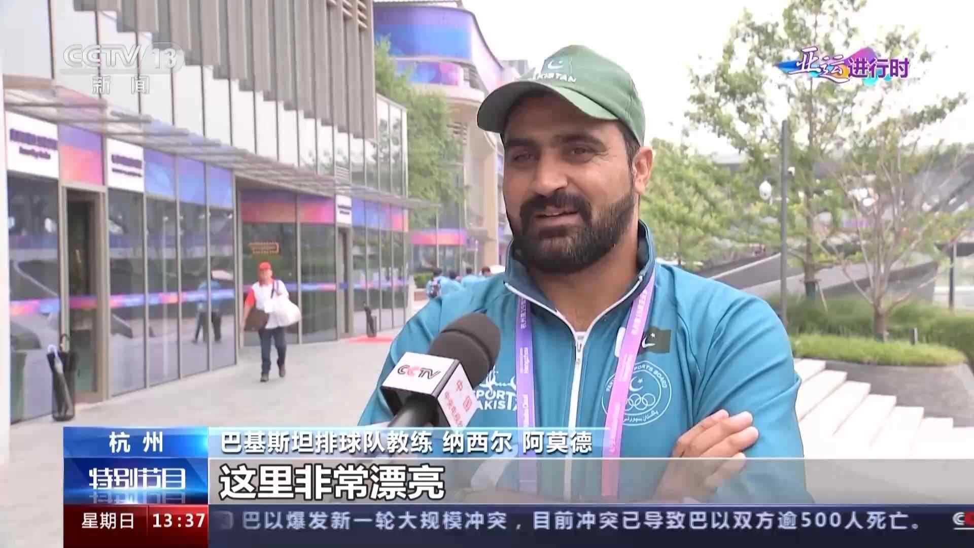 巴基斯坦排球队教练 纳西尔·阿莫德:这是我第一次来到杭州,这里非常漂亮,每个人都很友善,虽然我们语言和文化习俗不同,中国人民的热情招待,让我们就像回家一样。我们的队员能取得今天的成绩,都受益于中国朋友为我们建造的体育中心,那是我们国家冠军的摇篮,真的感谢中国的朋友们。