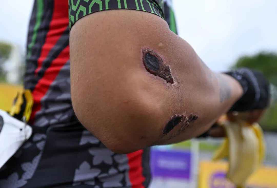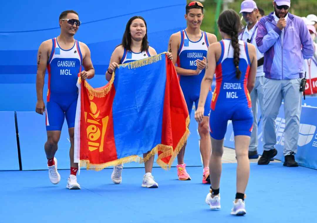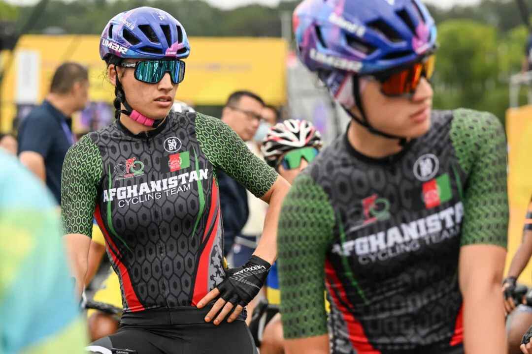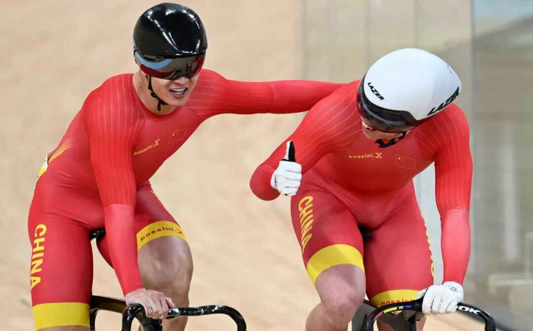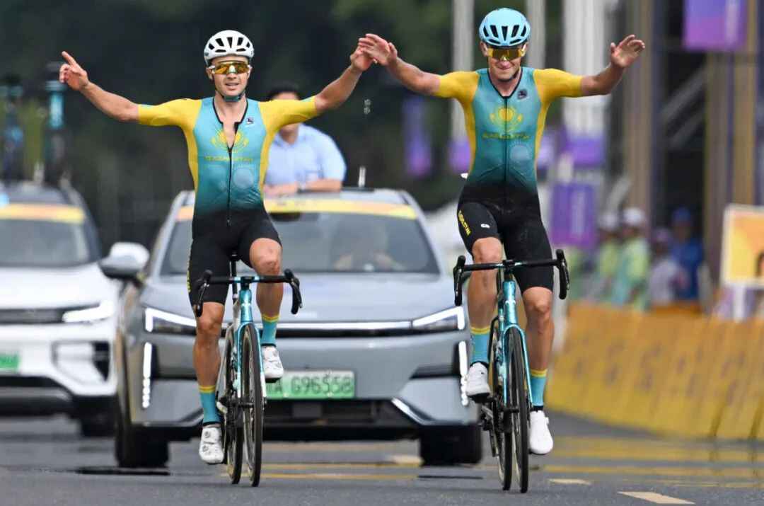 哈萨克斯坦选手丹尼斯·谢尔吉延科(左)和新加坡选手宾·卢克曼·里亚德·哈基姆出发前相互致意
