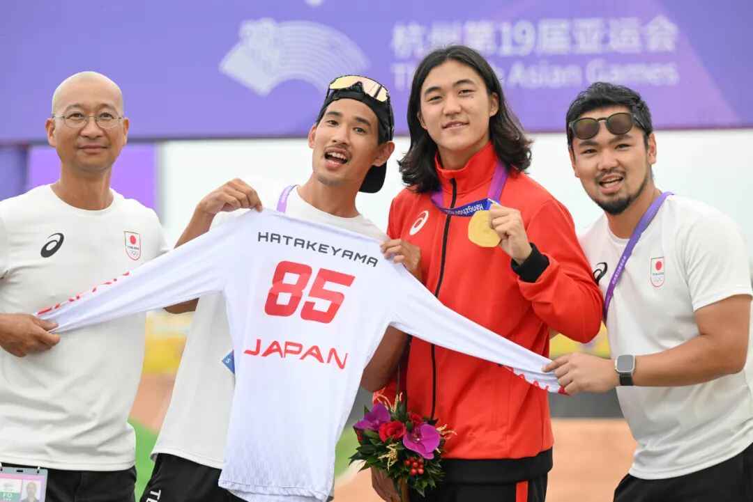 日本选手中井飞马(右二)和教练组人员带着因伤退赛队友的衣服合影