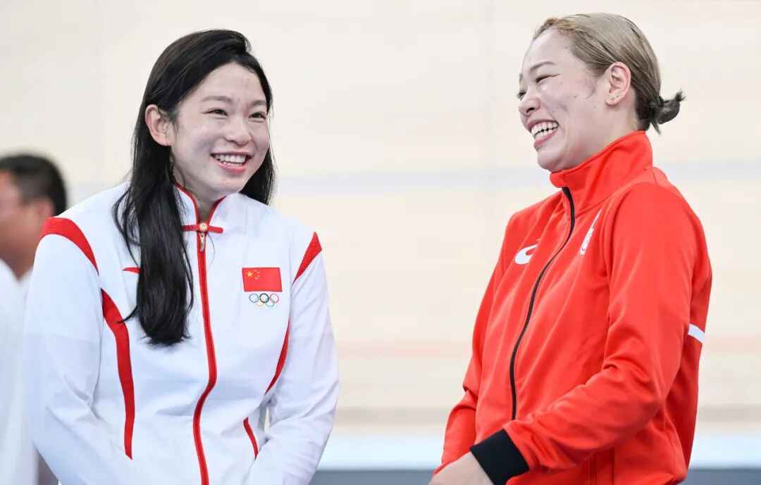 日本选手佐藤水菜(右)和中国选手王丽娟聊天