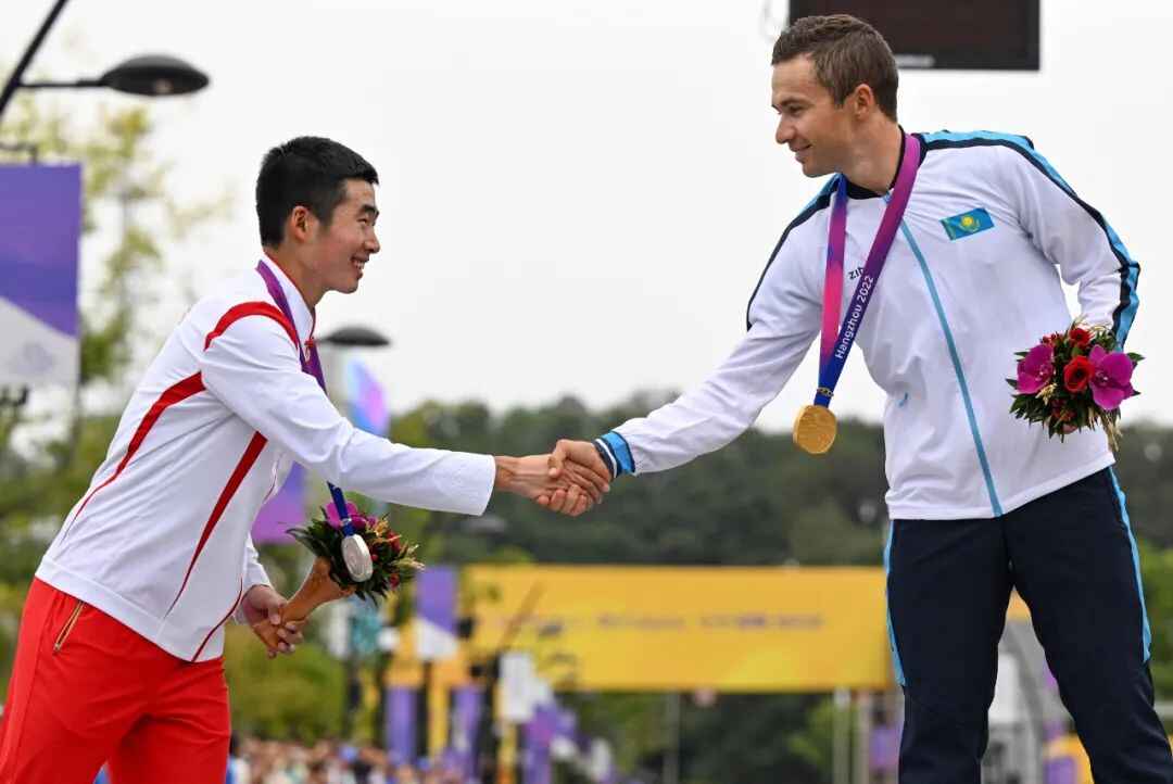 中国选手薛铭(左)与哈萨克斯坦选手阿列克谢·卢岑科握手致意
