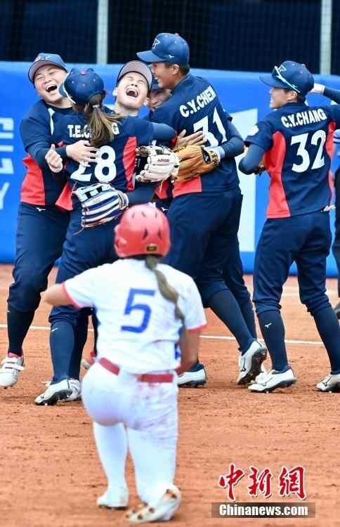 10月2日,杭州第19届亚运会女子垒球铜牌赛在绍兴棒(垒)球体育文化中心举行,中国台北队(蓝衣)3比2战胜菲律宾队夺得铜牌。图为中国台北队庆祝胜利。