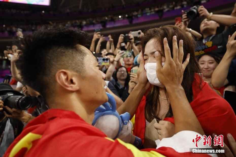 9月30日,杭州第19届亚运会田径男子100米决赛在杭州奥体中心体育场举行,中国选手谢震业以9秒97获得金牌。图为谢震业(左)安抚激动落泪的妻子。