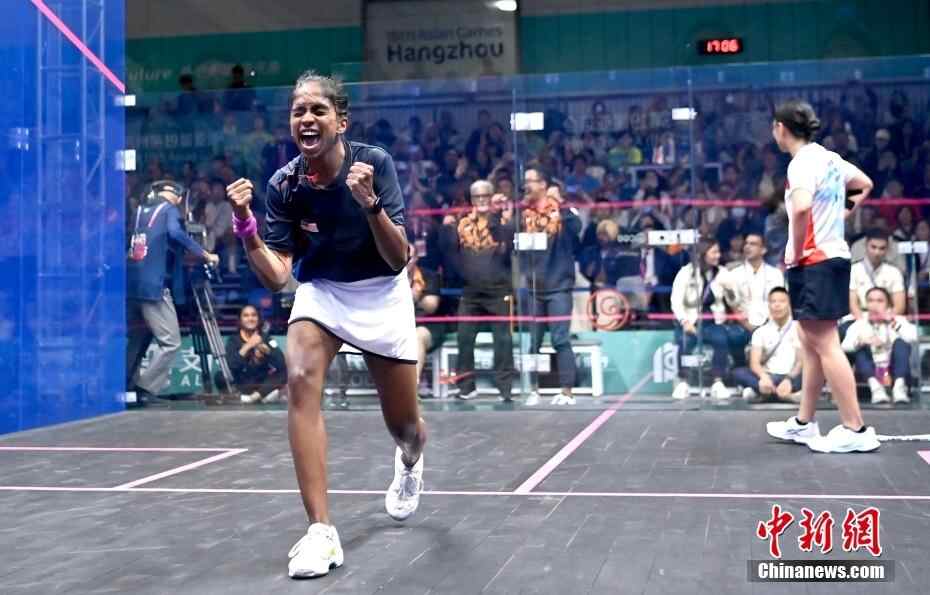 10月5日,杭州第19届亚运会壁球女子单打决赛在杭州奥体中心国博壁球馆举行,马来西亚选手苏布拉马尼娅姆·西瓦桑加里(左)3比2战胜中国香港选手陈善钰夺得该项目金牌。