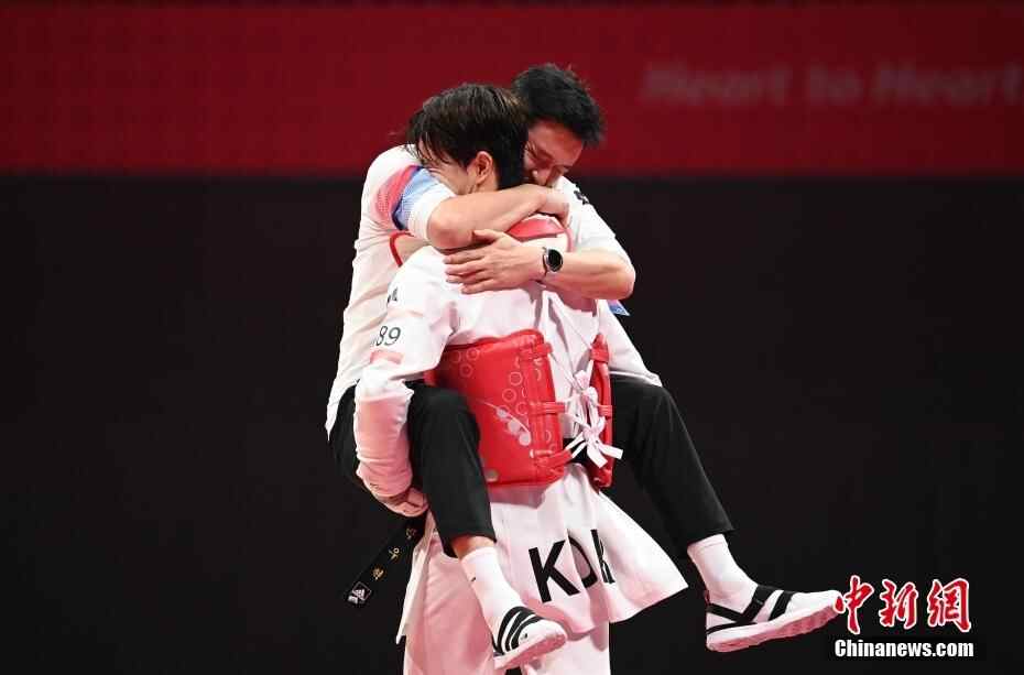 9月27日,杭州第19届亚运会跆拳道男子80公斤级决赛在临安体育文化会展中心体育馆举行,韩国选手朴优赫战胜约旦选手萨利赫·沙拉巴蒂夺得金牌。图为朴优赫夺冠后与教练紧紧拥抱。