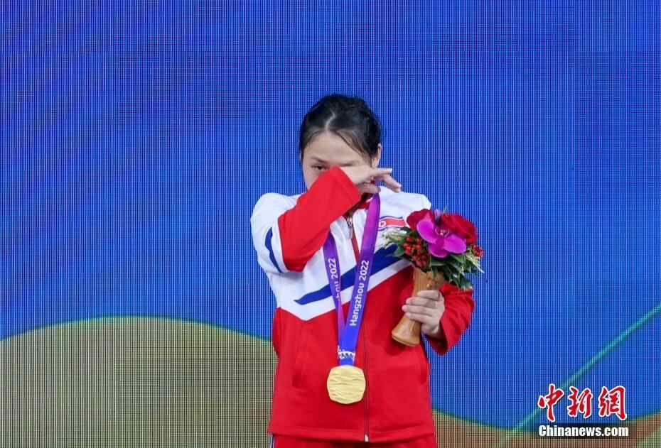 9月30日,杭州第19届亚运会举重女子49公斤级比赛在杭州萧山体育中心体育馆举行,朝鲜选手李盛金以挺举124公斤刷新中国选手蒋惠花保持的世界纪录,并以总成绩216公斤刷新世界纪录夺金。图为李盛金在颁奖仪式上。