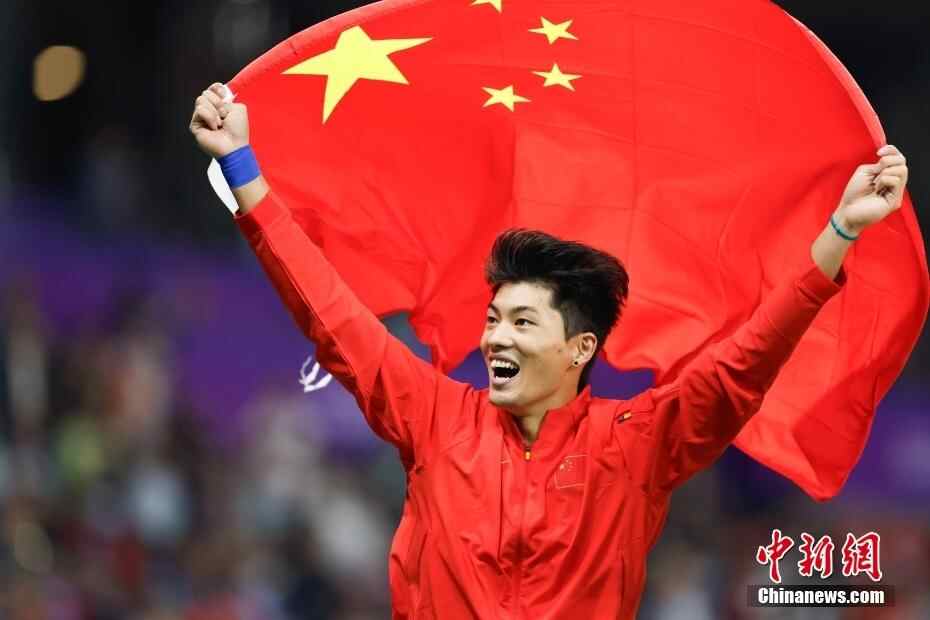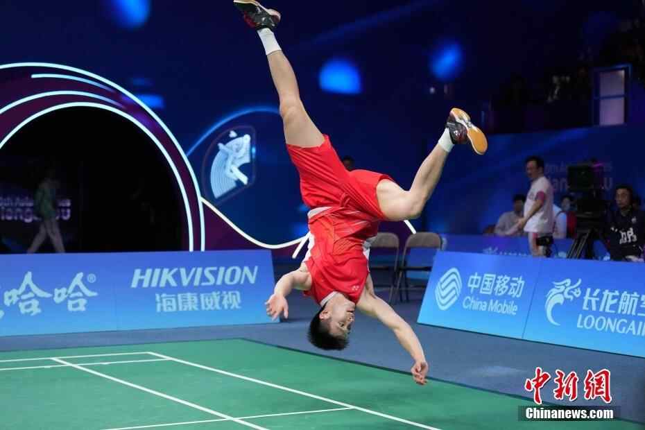 10月7日,杭州第19届亚运会羽毛球男子单打决赛在滨江体育馆举行,中国选手李诗沣2比0击败队友石宇奇,夺得冠军。图为李诗沣空翻庆祝胜利。