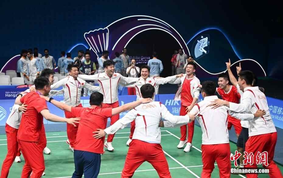 10月1日,杭州第19届亚运会羽毛球男子团体决赛在滨江体育馆举行,中国队3比2战胜印度队获得冠军。图为中国队庆祝夺冠。