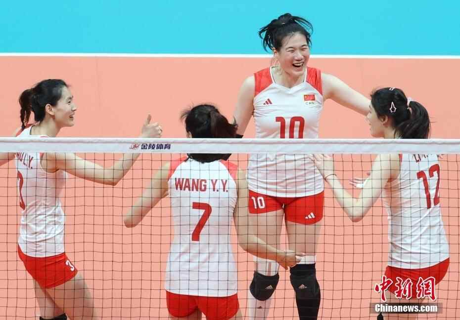0月7日,杭州第19届亚运会女子排球决赛在杭州师范大学(仓前校区)体育馆举行,中国队(白)3比0战胜日本队,获得金牌。图为中国选手庆祝得分。