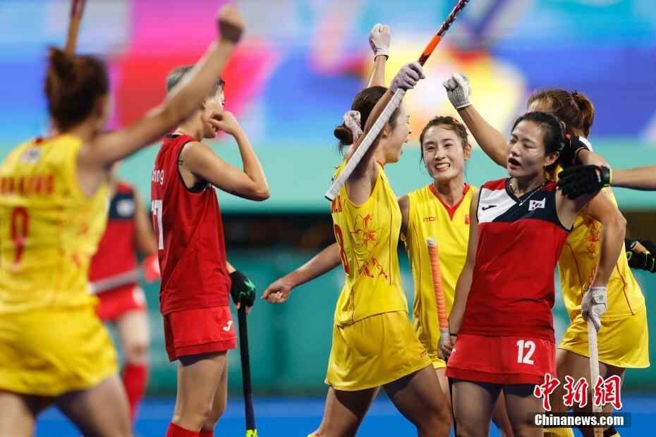10月7日,杭州第19届亚运会女子曲棍球决赛在拱墅运河体育公园体育场举行,中国队(黄衣)以2比0战胜韩国队(红衣)获得金牌。图为中国队庆祝胜利。