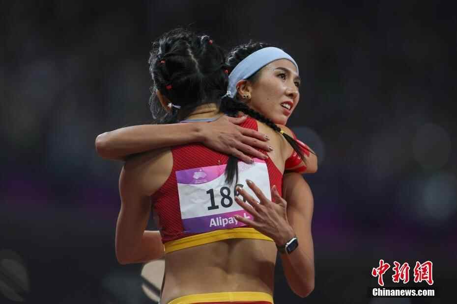 10月1日,杭州第19届亚运会田径项目女子100米跨栏决赛在杭州奥体中心体育场举行,中国选手林雨薇以12秒74获得冠军。图为林雨薇(右)与吴艳妮在赛后拥抱。