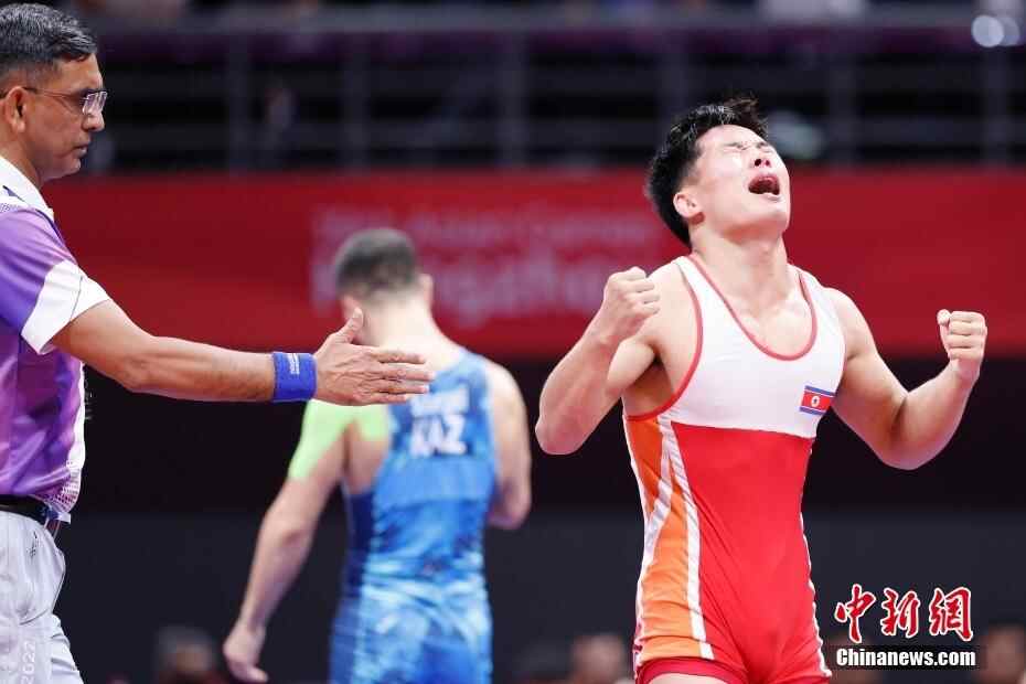10月4日,杭州第19届亚运会摔跤男子古典式60公斤级铜牌赛在临安体育文化会展中心体育馆举行,朝鲜选手李世雄(红方)战胜哈萨克斯坦选手艾多斯·苏丹加利获得铜牌。图为李世雄在比赛结束后呼喊庆祝。