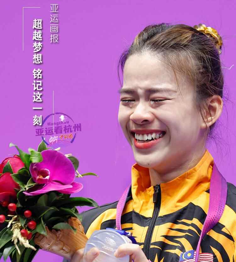9月26日,杭州第19届亚运会武术女子南刀决赛在杭州萧山瓜沥文化体育中心举行,马来西亚队选手陈昌敏获得亚军。图为陈昌敏在颁奖仪式上激动落泪。