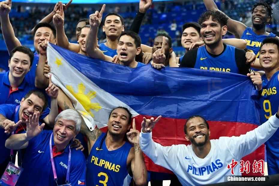 10月6日,杭州第19届亚运会男子篮球决赛在杭州奥体中心体育馆举行,菲律宾男篮以70比60战胜约旦男篮夺冠。图为菲律宾队庆祝胜利。