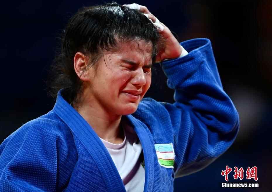 9月25日,杭州第19届亚运会柔道女子70公斤级铜牌赛在萧山临浦体育馆举行,乌兹别克斯坦女选手古尔诺扎·马特尼亚在赢得比赛后泪流满面。