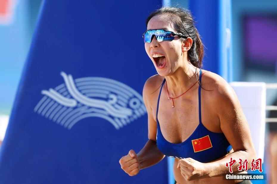 9月27日,杭州19届亚运会沙滩排球项目女子铜牌赛在宁波半边山沙排中心举行,中国队组合董颉、王凡2比0战胜泰国队夺得铜牌。图为董颉在比赛后呐喊庆祝。