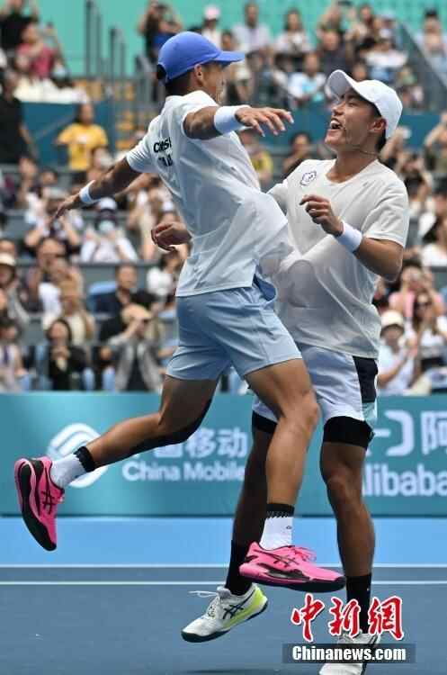 9月29日,杭州第19届亚运会网球男子双打决赛在杭州奥体中心网球中心举行。中国台北组合许育修/庄吉生2比0战胜印度组合萨凯特·米内尼/拉姆库马尔·拉马纳坦,夺得冠军。图为许育修(右)/庄吉生(左)庆祝夺冠。