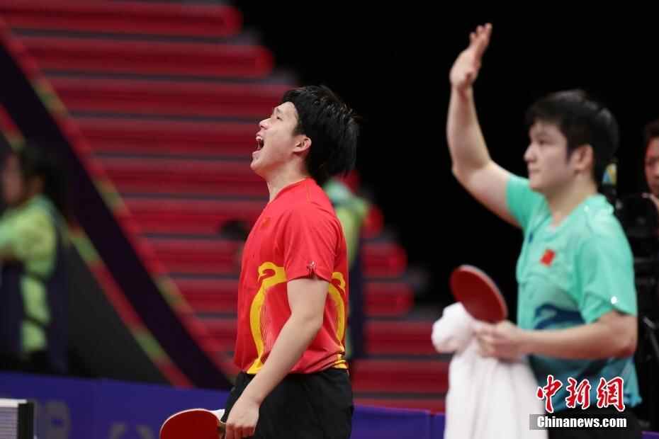 10月2日,杭州第19届亚运会乒乓球男子单打决赛在拱墅运河体育公园体育馆举行,中国选手王楚钦4比3险胜队友樊振东,获得冠军。图为王楚钦(左)庆祝胜利。