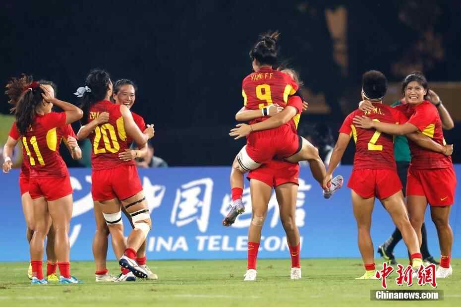9月26日,杭州第19届亚运会七人制橄榄球女子决赛在杭州师范大学(仓前校区)体育场进行。中国队以22比21战胜日本队摘得金牌。图为赛后中国队庆祝胜利。