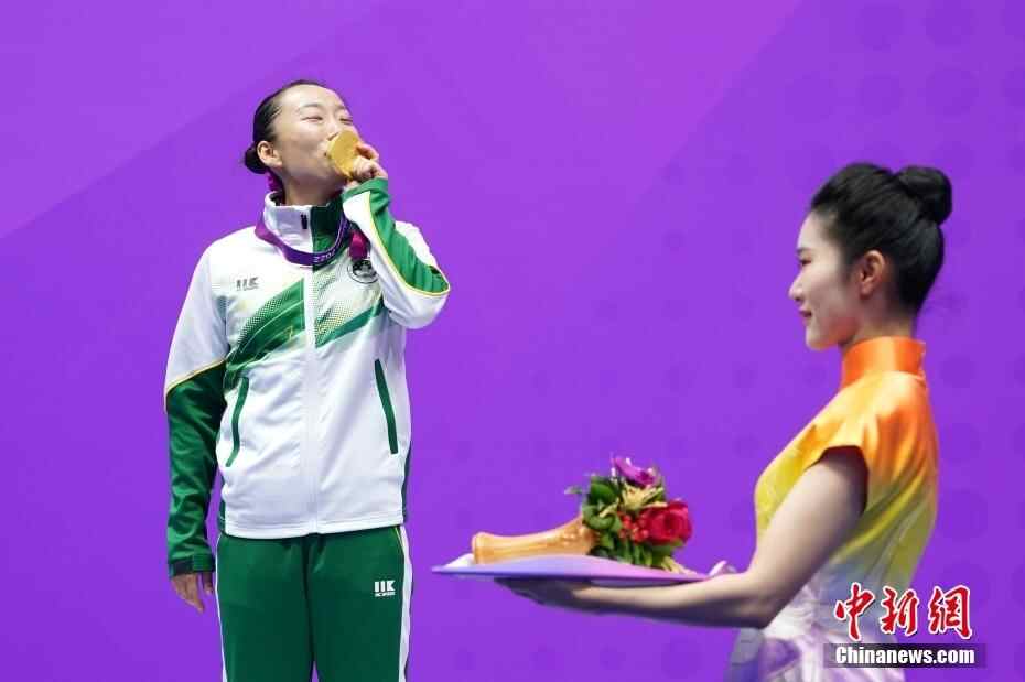 9月25日,杭州第19届亚运会武术女子长拳决赛在杭州萧山瓜沥文化体育中心举行。中国澳门选手李祎以总成绩9.786分为澳门队摘得武术项目首金。该枚金牌也是中国澳门代表队在本届亚运会上的首金。图为中国澳门队选手李祎亲吻金牌。