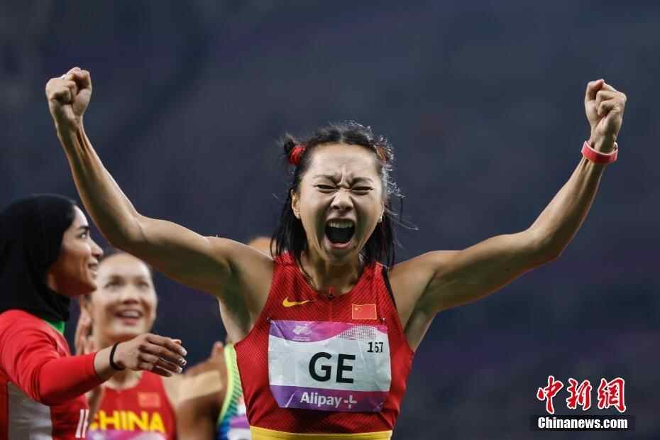 9月30日,杭州第19届亚运会田径项目女子100米决赛在杭州奥体中心体育场举行,中国选手葛曼棋以11秒23获得金牌。图为葛曼棋在赛后高举手臂庆祝。