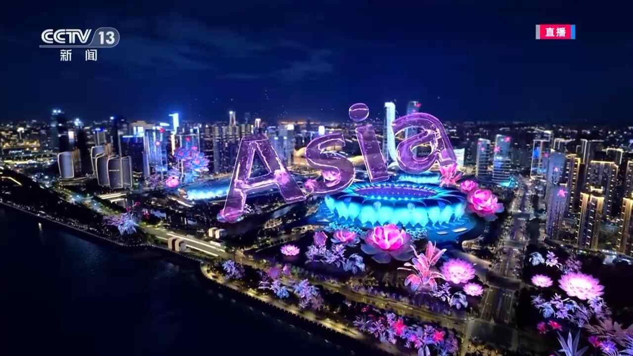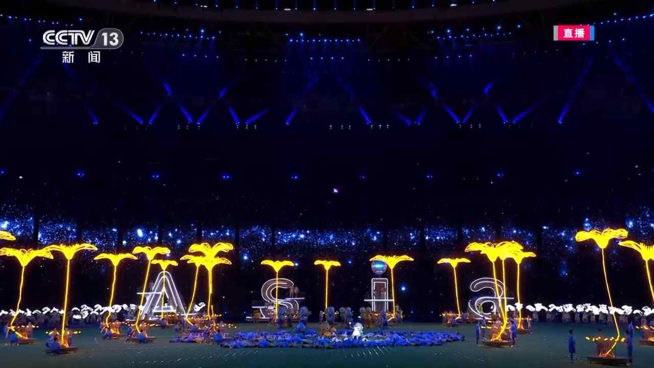 伴随着现场的童声演唱《江南好》,巨大的英文单词“Asia”从钱塘江边飘向奥体中心体育场,与奔涌的钱塘潮水融在一起,落在场内。