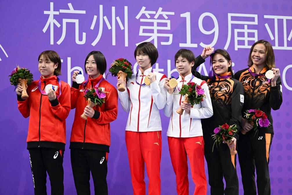 9月30日,冠军中国组合全红婵(右三)/陈芋汐(左三)、亚军日本组合板桥美波(左二)/荒井祭里(左一)、季军马来西亚组合潘德莱拉·里农·阿纳克·帕姆格(右一)/努尔·达比塔·宾蒂·萨布里在颁奖仪式上。新华社记者 薛宇舸 摄