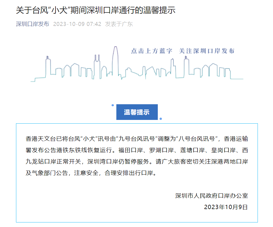 香港天文台已将台风“小犬”讯号由“九号台风讯号”调整为“八号台风讯号”,香港运输署发布公告港铁东铁线恢复运行。福田口岸、罗湖口岸、莲塘口岸、皇岗口岸、西九龙站口岸正常开关,深圳湾口岸仍暂停服务。请广大旅客密切关注深港两地口岸及气象部门公告,注意安全,合理安排出行口岸。