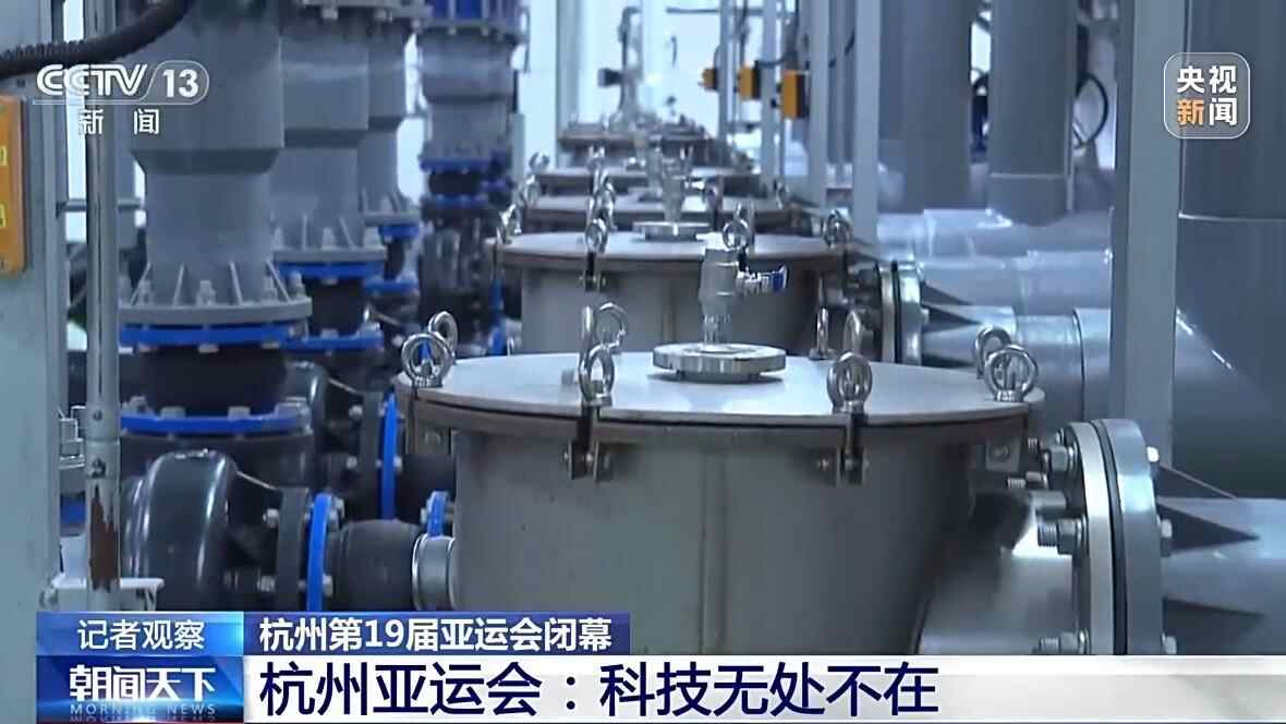 而科技的使用也助力着本届亚运会践行“绿色 高效”的诺言。在我们看激烈的乒乓球比赛的时候,旁边的训练馆,由于使用了导光孔的设计,只要室外光线充足,场馆内即便不用电,也能给在这里进行训练的运动员带来充足的照明。在游泳馆,当我们看各国运动员在清澈的游泳池中劈波斩浪的时候,在游泳池的下方,一套全年不用换水的水循环系统正在高速运转,有了这套系统,游泳馆一年可节水9万吨,相当于可提供4000人一年的用水量。还有可以自清洁的场馆外立面,可以吸水的屋顶,当科技与“节俭办亚运”相合,我们看到的是绿色、环保、无废的新的亚运办赛理念的成功实践。