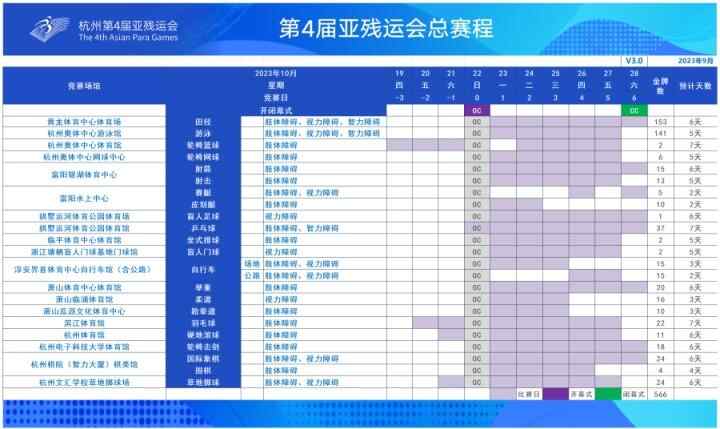 杭州亚残运会设有22个大项、564个预设小项。其中大项分别为: