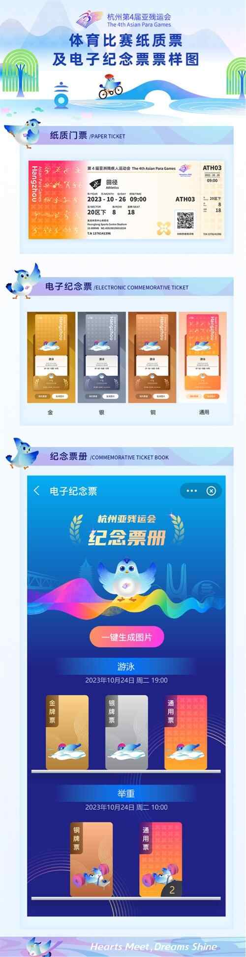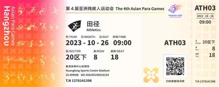 杭州亚残组委发布体育比赛纸质票及电子纪念票票样设计图。杭州第4届亚洲残疾人运动会体育比赛门票票面设计以“折桂”为主题,延续杭州亚运会“映日红”和“月桂黄”主色彩,辅以杭州亚残运会体育图标,展现了亚残运会运动员奋勇拼搏的运动激情和勇立潮头的时代精神。