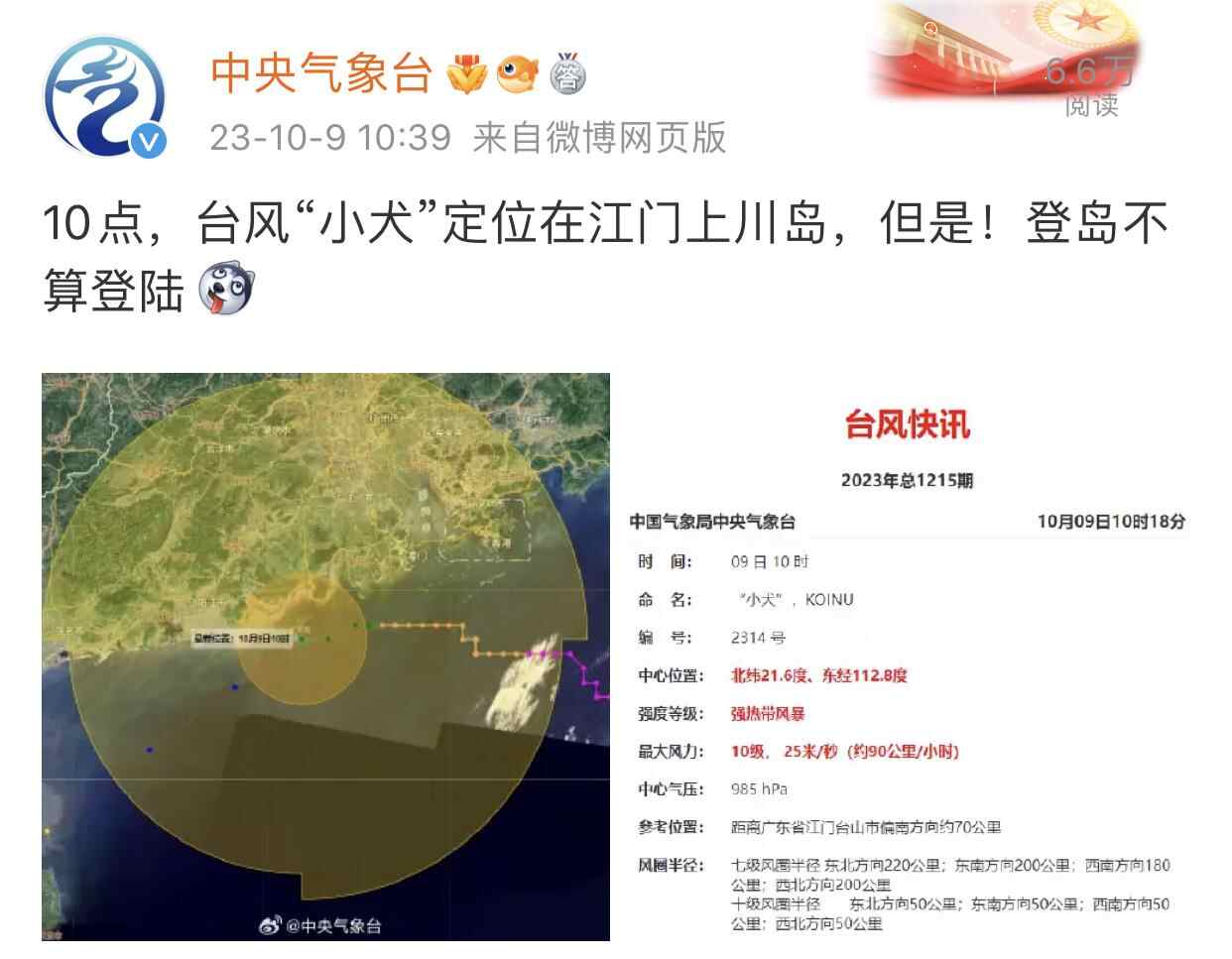 “10点,台风‘小犬’定位在江门上川岛,但是!登岛不算登陆。”10月9日上午,中央气象台通过新浪微博通报了今年第14号台风“小犬”的情况。