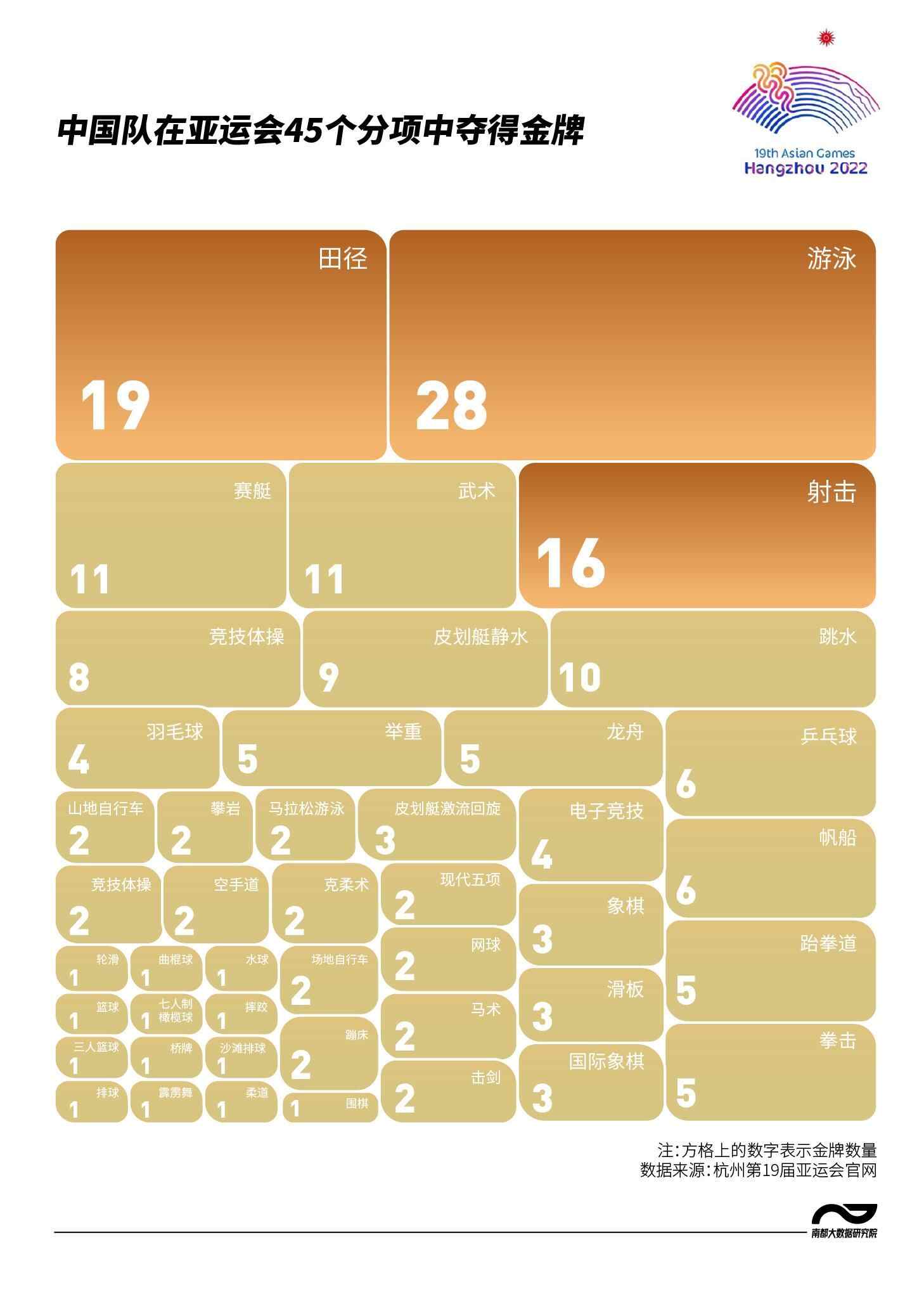 南都大数据研究院统计发现,本届亚运会中国队在45个分项夺魁,游泳、田径、射击项目分别获得28枚、19枚、16枚金牌,也在首次成为亚运会项目的电子竞技中收获4枚金牌。