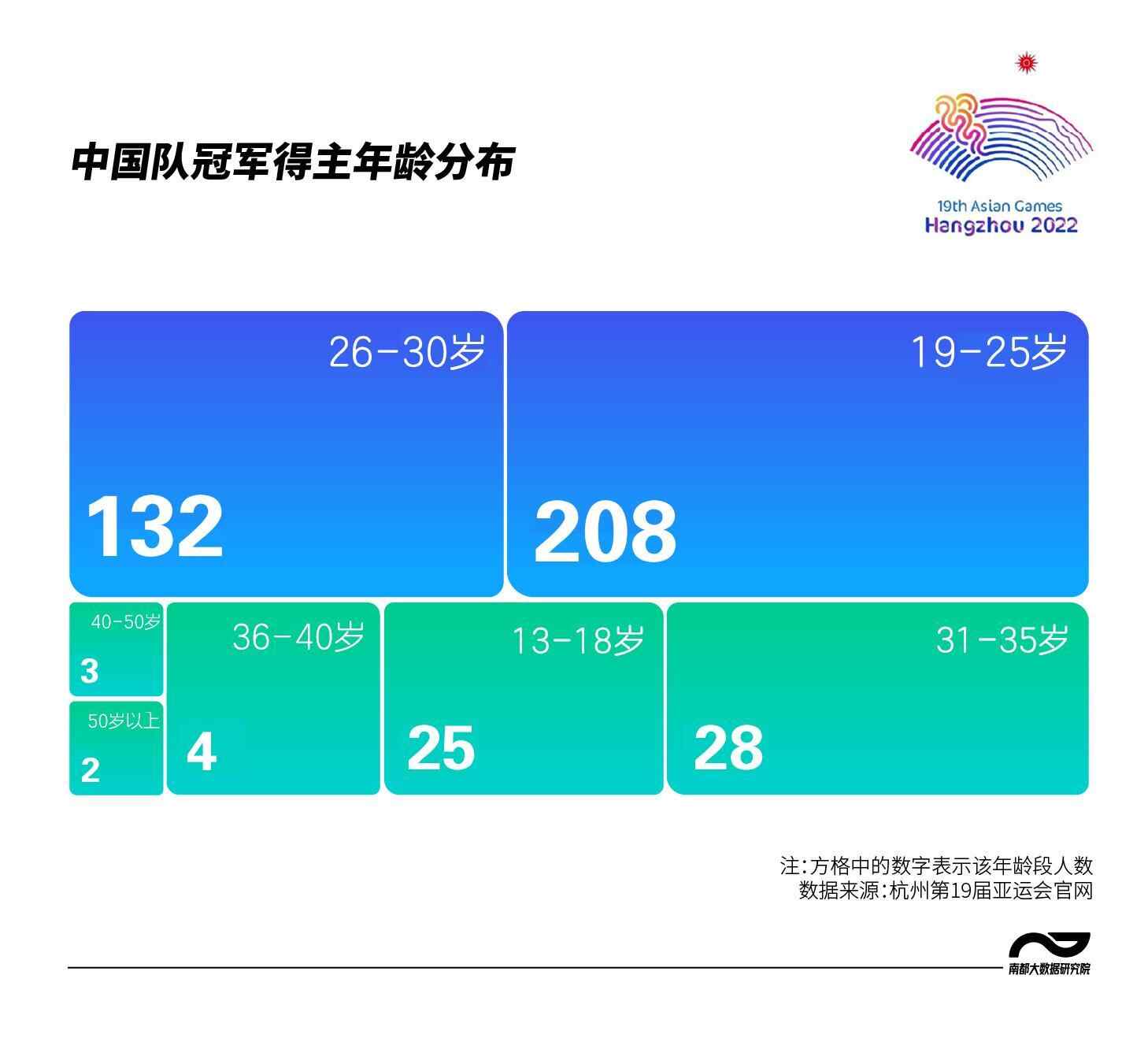 参加本届杭州亚运会并获得金牌的中国运动员超过400人,95后和00后占比超过七成半。19岁-25岁年龄段人数最多,有208人,是冠军主力。
