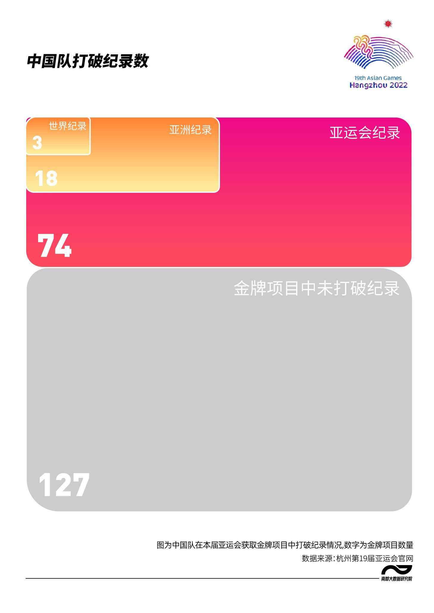 据统计,中国体育代表团在本届亚运会上3次打破世界纪录、18次打破亚洲纪录、74次打破亚运纪录。
