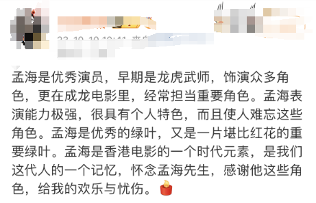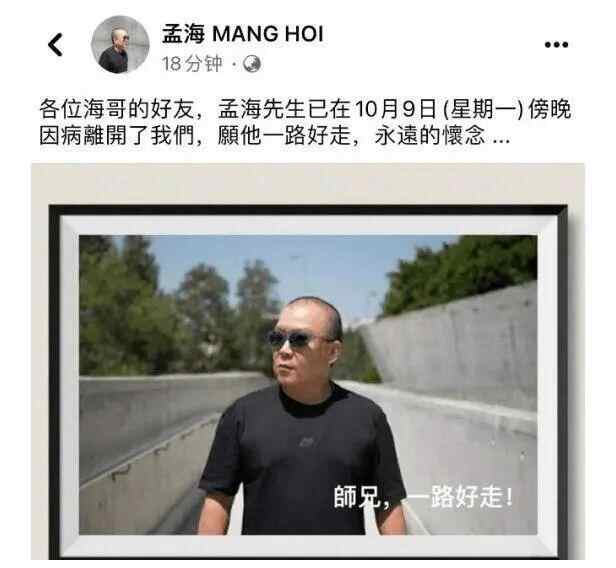 据香港《星岛日报》报道,曾凭《皇家师姐》夺得第5届香港电影金像奖最佳男配角奖的香港著名演员孟海10日凌晨传出去世的消息,多位圈中人在社交平台发文悼念。