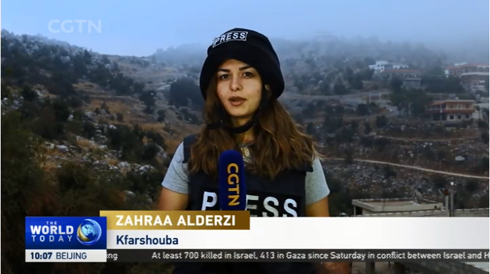 总台报道员扎赫拉·阿尔德齐,在黎巴嫩和以色列临时边界附近的卡夫乔巴,现场报道黎巴嫩真主党和以色列发生交火的情况。