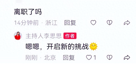 随后有网友在评论区问“离职了吗?”李思思对此回复道:“嗯嗯,开启新的挑战。”